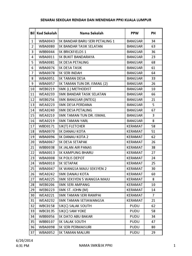 Up to 24 cash back Kod Sekolah Nama Sekolah PPW JPN Teknologi Tarikh Siap Pemasangan SENARAI SEKOLAH DI BAWAH PENTADBIRAN JPWP KUALA LUMPUR DAN JPWP PUTRAJAYA 79 WBA0091 SK SEGAMBUT MAKMUR PPW SENTUL Zoom 29-Dec-11 80 WBA0092 SK SERI ANGGERIK PPW BANGSAR PUDU Zoom 16-Jan-12 81 WBA0093 SK COCHRANE. Kelas aliran agama selangor 1. SRA Saidina Ali KW Lot 58057 Pdg Balang 51100 Kuala Lumpur.